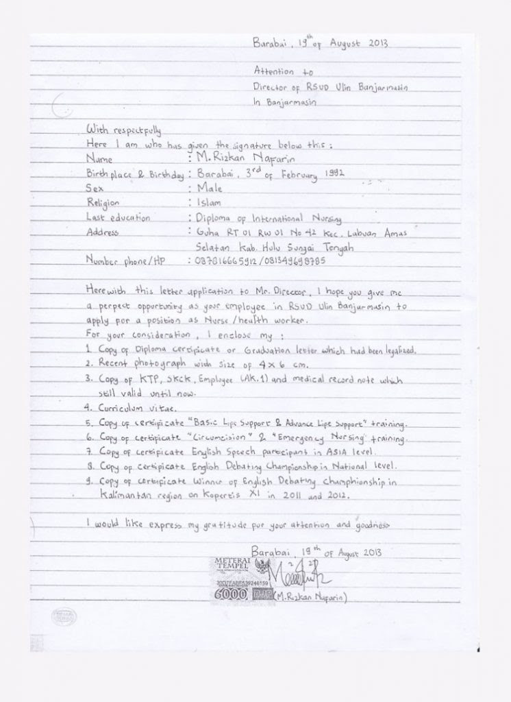 Cara membuat lamaran kerja bisa dengan dua cara yaitu dengan cara diketik atau dengan tulis tangan. Apabila dikemudian hari terdapat perbedaan, saya siap untuk mempertanggung jawabkannya. Anda bisa menulis contoh surat lamaran kerja tulis tangan seperti di bawah ini saat akan melamar pekerjaan di hotel tertentu. Untuk menulis surat lamaran kerja itu bisa ditulis tangan bisa juga di ketik menggunakan komputer, namun kebanyakan orang menulis surat lamaran kerja itu adapun cara membuat contoh surat lamaran kerja yang bagus dan bisa diterima di perusahaan yang dituju ada beberapa tips dan triknya. Yaitu surat lamaran kerja yang ditulis langsung pakai tulisan tangan. Cara membuat surat lamaran pekerjaan tulis tangan yang akan saya jelaskan terbagi menjadi beberapa tahapan,mulai dari gaya bahasa,penulisan dan juga kerangka yang baik dan benar.silahkan ikuti panduan atau penjelasanya di bawah ini. Setelah menemukan lowongan yang sesuai dengan keinginan dan kemampuan anda, maka bisa mengirimkan lamaran. Surat lamaran pekerjaan umumnya bersifat formal atau resmi, misalnya surat untuk melamar pekerjaan menjadi karyawan atau jabatan tertentu sesuai dengan iklan yang ditawarkan. Surat keterangan sehat dari dokter. Umumnya di dalam surat lamaran kerja terdapat resume dan juga sertifikat yang harus ada dalam tulis dengan tulisan tangan yang rapi agar mudah dibaca oleh penerima. Surat lamaran kerja yang ditulis tangan bukan hanya sekedar surat lamaran semata, namun biasanya ada juga perusahaan yang melakukan seleksi dan penilaian karakter sang pelamar dengan melihat goresan tangan pada surat lamaran kerja yang ditulis tangan. Lebih baik tulis lagi di. Bukan bearti jika lamaran kerja yang anda buat menggunakan tulisan tangan sendiri, lantas surat lamaran yang anda kirim dapat langsung di terima dan memancing perhatian.